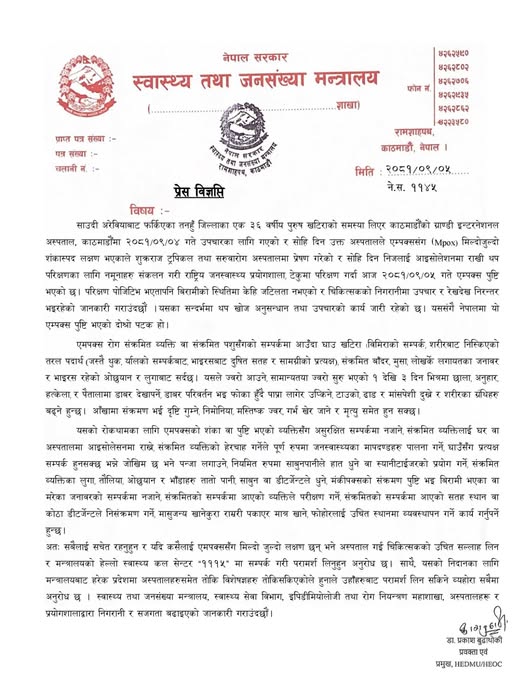 दुई वर्षअगाडि पनि नेपाल आएका एकजना विदेशीमा मंकीपक्स संक्रमण देखिएको थियो । उनले मंकीपक्स संक्रमण देखिएपछि सीमा नाका र त्रिभुवन अन्तर्राष्ट्रिय विमानस्थलमा रहेका ‘हेल्थ डेक्स’लाई सतर्कता अपनाउन सरकारले निर्देशन दिएको प्रवक्ता बुढाथोकीले बताए ।