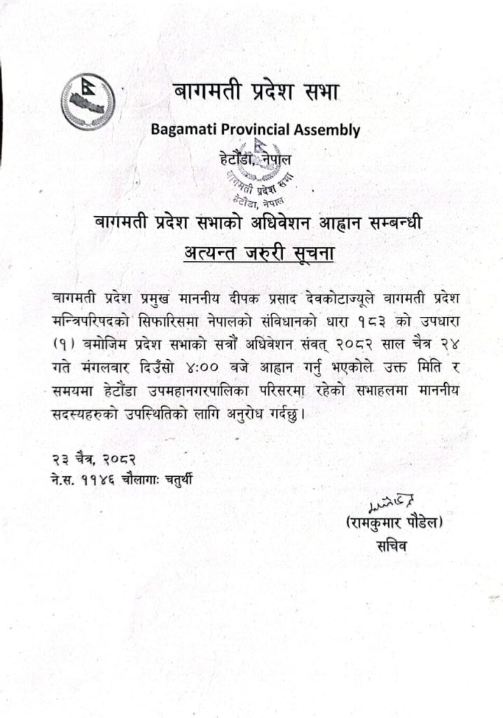 बागमती प्रदेशको बजेट अधिवेशन आजबाट सुरु हुँदै