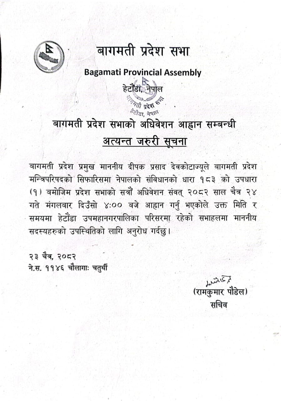 हेटाैँडा । बागमती प्रदेशसभाको बजेट अधिवेशन आजबाट सुरु हुँदै छ । आइतबारको बागमती प्रदेश सरकारको मन्त्रिपरिषद् बैठकले चैत २४ गते मंगलबार दिउँसो ४ बजेका लागि प्रदेशसभा बैठक आह्वान गर्न प्रदेश प्रमुखसमक्ष सिफारिस गर्ने निर्णय गरेको हो । प्रदेशसभाको बैठक हेटौंडा–२ स्थित हेटौंडा उपमहानगरपालिकाको सभा हलमा बस्दैछ ।