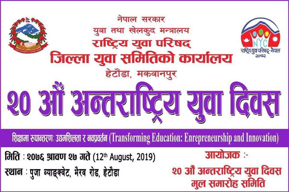 हेटाैँडा । “शिक्षा रुपान्तरण : उधमशिलता र नवप्रवर्तन” भन्ने मूल नाराका साथ हेटाैँडामा २० औं अन्तर्राष्ट्रिय युवा दिवस मनाइएकाे छ ।